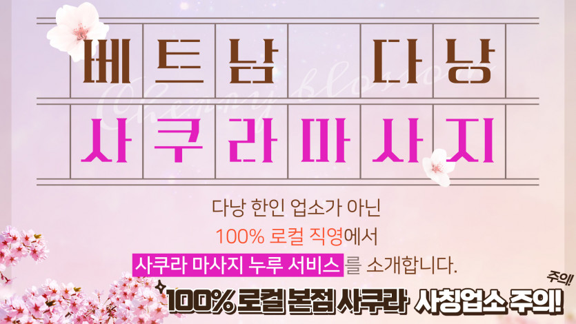다낭에는 사쿠라 마사지 업소가 2곳 있습니다. 이곳은 100% 로컬 본점으로 운영되고 있는 곳이며 시스템부터 서비스까지 최고 만족도로 평가받고 있는곳이라 자부하는 곳 입니다. 기본 누루 바디 마사지를 제공하고 있으며 일본식 시스템을 장착하여 서비스하고 있는 곳입니다. 로드샵으로 운영되고 있으며 큰 간판으로 SAKURA 라고 쓰여져 있으며 차량 픽업이 필요하신 분들께선 아래 문의처로 연락주시면 감사하겠습니다.